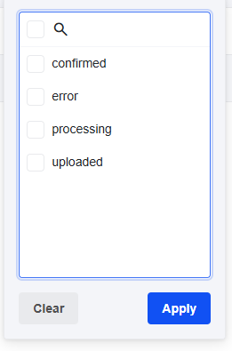 - List filter: displays values found in the column. Filtering is done by checking the desired item(s). A search field at the top helps to locate values.