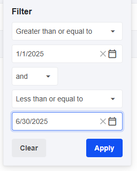 Tables allow filtering data based on various conditions. Clicking thefilter icon in the column header opens the filter panel, where the desired value or range can be set. After setting the filter conditions, click the Apply button to activate filtering. To remove a filter from a column, click the Clear button in the corresponding filter panel.